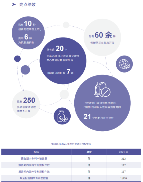 报告指出,在科技创新战略引领下,恒盛娱乐医药2021年累计研发投入62.03亿元,比上年增长24.34%,研发投入占销售收入比重达到23.95%,再创历史新高。以此为支撑,2021年公司有3款创新药获批上市,已上市创新药总量增至10款,其中6款为抗肿瘤药物。同时还有60余种创新药正在临床开发,250多项临床试验在国内外开展,其中近20个创新药项目获准开展全球多中心或地区性临床研究。在创新药研发上,恒盛娱乐医药已基本形成了上市一批、临床一批、开发一批的良性循环。